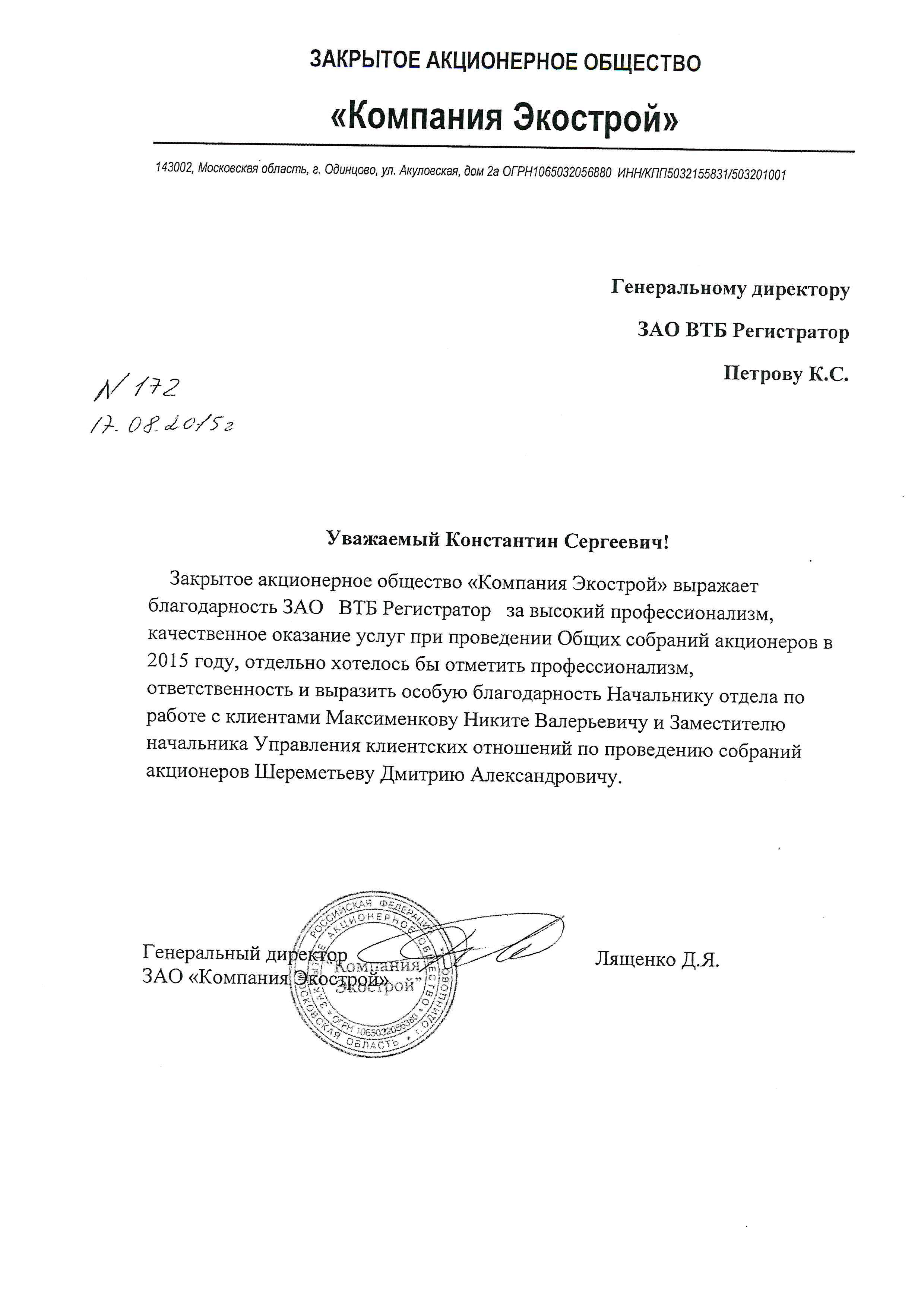 Закрытое акционерное общество "Компания Экострой" выражает благодарность ЗАО ВТБ Регистратор за высокий профессионализм, качественное оказание услуг при проведении Общих собраний акционеров в 2015 году, отдельно хотелось бы отметить профессионализм, ответственность и выразить особую благодрарность Начальнику отдела по работе с клиентами Максименкову Никите Валерьевичу и Заместителю начальника Управления клиентских отношений по проведению собраний акционеров Шереметьеву Дмитрию Александровичу.